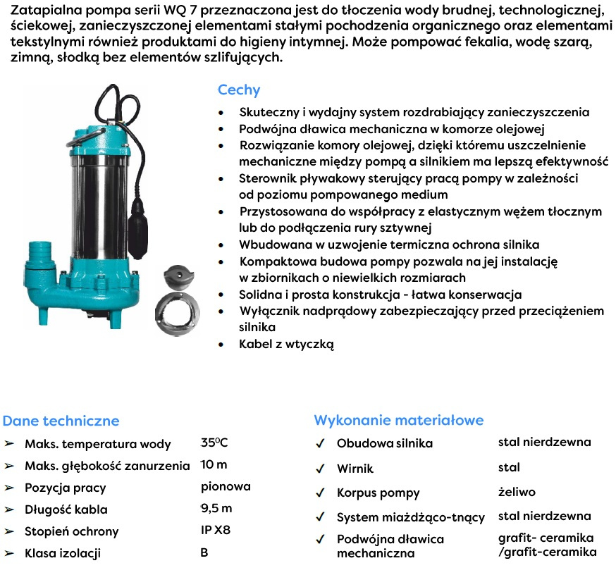 Pompy zatapialne Omnigena z serii WQ 7 to trwałe i wydajne pompy, wytworzone z wytrzymałej stali nierdzewnej INOX. Wyposażone są w rozdrabniacz, czyli specjalny nóż tnący, który poradzi sobie z obecnością dużych zanieczyszczeń. Wyróżniają się bardzo dobrymi parametrami oraz niską ceną, dzięki czemu urządzenia te są bardzo atrakcyjne i często wybierane przez indywidualnych odbiorców. Przeznaczone są do pompowania ścieków surowych, gnojowicy, wody z obecnością zanieczyszczeń włóknistych, oraz czystej, zimnej wody, której maksymalna temperatura nie będzie większa niż 35°C. Wykorzystywane są do indywidualnego użytku, między innymi przez rolników, do wypompowywania szamba, wody z zalanych pomieszczeń, czerpania wody ze stawów oraz podlewania ogródków. Znajdują również zastosowanie w firmach budowlanych do opróżniania zalanych wykopów czy budowanych piwnic. Pompy wyposażone są w króćce, przeznaczone do pracy z elastycznymi wężami, a także w wbudowany sterownik pływakowy. Maksymalna głębokość zanurzenia pomp zatapialnych Omnigena serii WQ I7 wynosi 5 m.