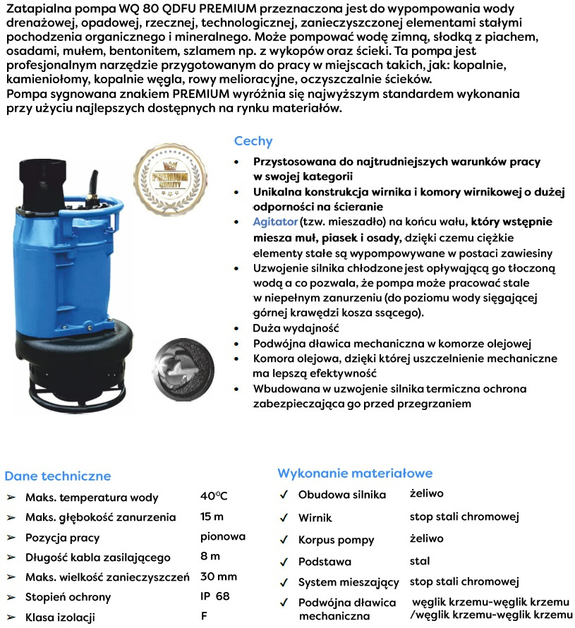 Pompy zatapialne Omnigena z serii WQ QDFU PREMIUM to trwałe i wydajne pompy, wyróżniające się ponadprzeciętną sprawnością i wszechstronnością. Przeznaczone są do wykorzystania dla użytku domowego oraz pracy w ciężkich warunkach. Znakomicie radzą sobie podczas pompowania cieczy z obecnością ciał stałych szlifujących i długowłóknistych dlatego mogą pompować: ścieki surowe, wody gruntowe i deszczowe, wody drenażowe z kamieniołomów kopalni i budów, wody ze zbiorników wodnych i zalanych pomieszczeń jak również czystej, zimnej wody, o maksymalnej temperaturze do 40°C. Wykorzystywane są na szeroką skalę, np w inżynierii lądowej jak kamieniołomy, górnictwo; w firmach budowlanych; przedsiębiorstwach komunalnych; do użytku domowego. Pompy wyróżniają się specjalną konstrukcją, która zapewnia optymalne chłodzenia za sprawa pompowanej cieczy. Posiadają także wbudowany sterownik pływakowy, który steruje praca pompy. Pompy zatapialne WQ QDFU PREMIUM przeznaczone są do ciągłej pracy, nawet podczas niepełnego zanurzenia.