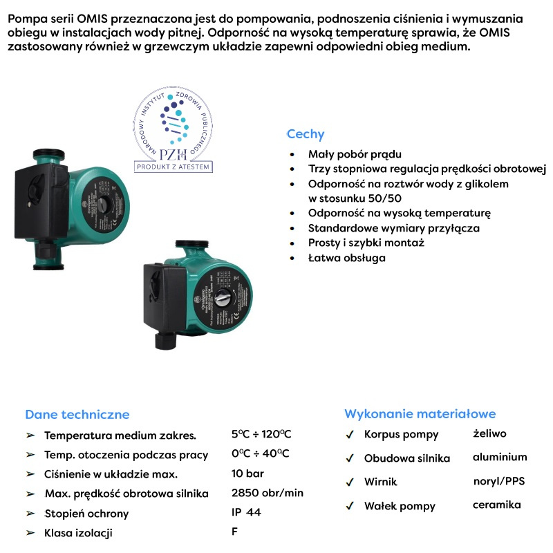 Pompy cyrkulacyjne C.O. Omnigena serii Omis przeznaczone są do wymuszania obiegu wody w układach centralnego ogrzewania i w systemach ogrzewania solarnego, a także do pompowania wody pitnej. Wyróżniają się trzystopniową regulacją prędkości obrotowej. Wykorzystywane są do pracy w obiegach wodnych, oraz obiegach wypełnionych wodą z domieszką glikolu, których maksymalna temperatura nie będzie niższa niż 5°C, a jednocześnie nie przekroczy 120°C. Urządzenia Omis nie mogą pompować wody z glikolem, w której obecne są stałe zanieczyszczenia, takie jak kamień kotłowy lub rdza. Wysoka jakość pomp cyrkulacyjnych C.O. Omnigena Omnis w połączeniu ze standardowymi wymiarami montażowymi sprawia, że są to jedne z najczęściej wybieranych urządzeń do wymuszania obiegu wody. Pompy obiegowe Omis powinny być montowanie w zadaszonych, pozbawionych wilgoci pomieszczeniach.