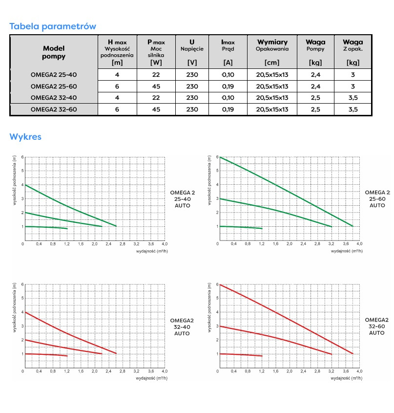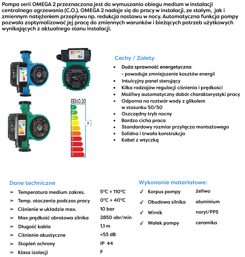 Pompy obiegowe Omnigena serii OMEGA 2 to automatyczne, elektroniczne urządzenia, służące do wymuszania obiegu wody w niewielkich układach centralnego ogrzewania. Wyróżniają się trzystopniową regulacją prędkości obrotowej. Wykorzystywane są do pracy w obiegach wodnych, oraz obiegach wypełnionych do połowy wodą i do połowy glikolem, których maksymalna temperatura nie będzie niższa niż 5°C, a jednocześnie nie przekroczy 110°C. Urządzenia OMEGA 2 nie mogą pompować wody z glikolem, w której obecne są stałe zanieczyszczenia, takie jak kamień kotłowy lub rdza. Wysoka jakość pomp obiegowych Omnigena OMEGA 2, w połączeniu z dużą energooszczędnością, dzięki automatycznemu sterowaniu różnica ciśnienia sprawia, że są to jedne z najczęściej wybieranych urządzeń do wymuszania obiegu wody. Pompy obiegowe OMEGA 2 powinny być montowanie w zadaszonych, pozbawionych wilgoci pomieszczeniach.