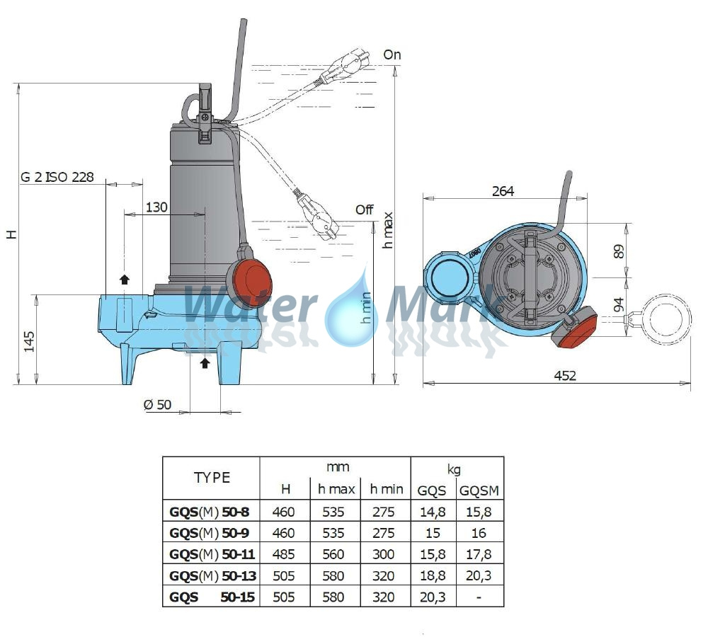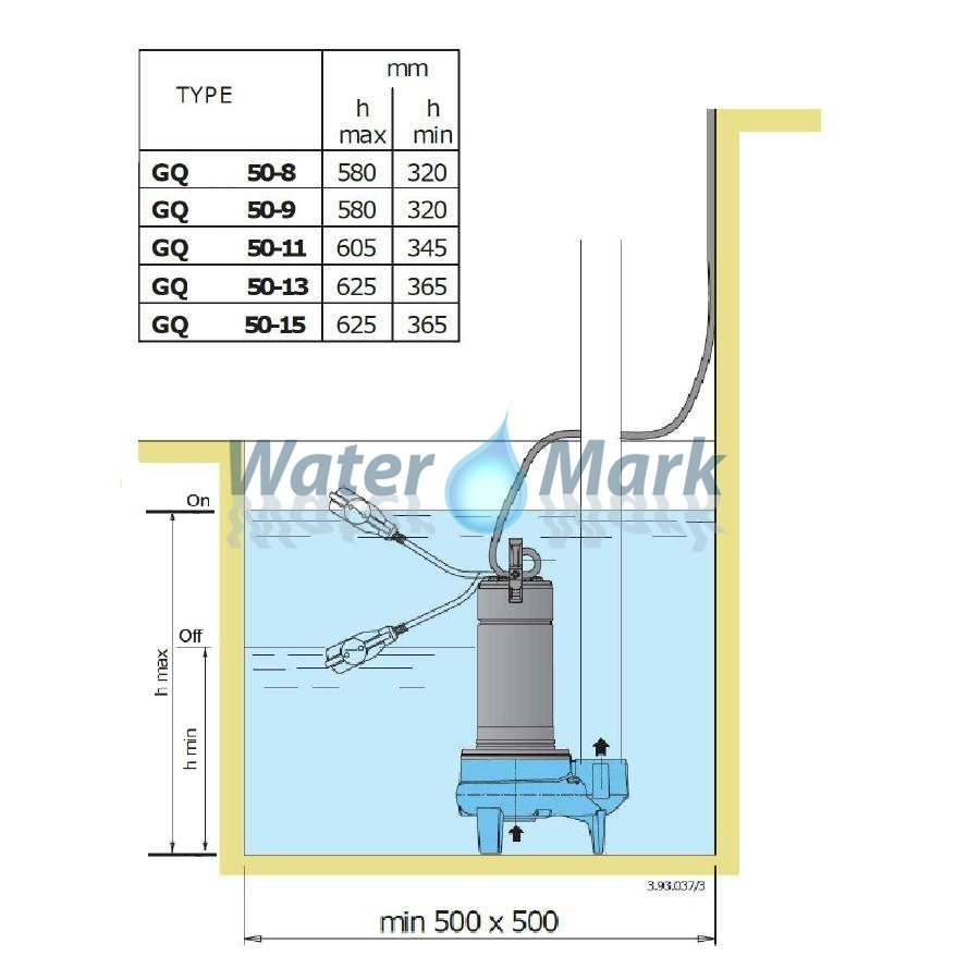 Pompy zatapialne CALPEDA serii GQSM to wydajne, trwałe i odporne na zanieczyszczenia pompy, wyposażone w pojedynczy, otwarty wirnik wykonany z żeliwa oraz wertykalny pionowy króciec tłoczny o średnicy 2''. Pompy zatapialne GQSM przeznaczone są do tłoczenia czystej wody, oraz ścieków przemysłowych i bytowych z obecnością zanieczyszczeń, o maksymalnej wielkości ziaren wynoszącej 50mm. Maksymalna temperatura pompowanej cieczy nie powinna przekroczyć 35°C. Pompy CALPEDA GQSM wyróżniają się niewielkimi wymiarami, niską wagą, oraz bardzo dobrymi parametrami użytkowymi. Dzięki temu z powodzeniem wykorzystywane są zarówno przez indywidualnych użytkowników, jak również i rolników, zakłady komunalne, firmy budowlane oraz przedsiębiorstwa i zakłady produkcyjne do opróżniania i odwadniania zagłębień, zbiorników czy pomieszczeń. Pompy zatapialne CALPEDA serii GQSM wyposażone są w pływakowy wyłącznik sterujący pracą pompy, a maksymalna głębokość ich zanurzenia wynosi 5m.