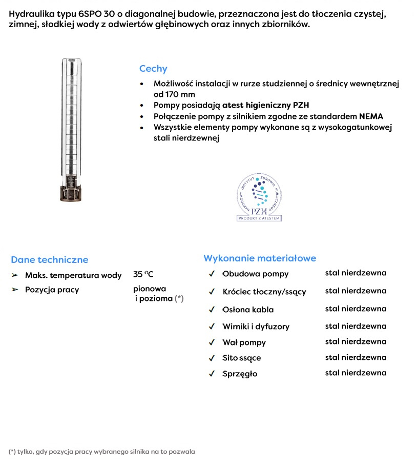 Pompy głębinowe serii SPO to jedne z najtrwalszych pomp dostępnych na rynku. Ich przeznaczeniem jest tłoczenie czystej, zimnej wody użytkowej, niezawierającej zanieczyszczeń ściernych i długowłóknistych, której temperatura nie jest większa niż 30°C. Pompy głębinowe SPO przystosowane są do pompowania nieagresywnej chemicznie cieczy ze studni głębinowych, oraz innych źródeł, w których lustro wody usytuowane jest na poziomie niższy niż 8m.