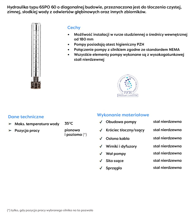 Pompy głębinowe serii SPO to jedne z najtrwalszych pomp dostępnych na rynku. Ich przeznaczeniem jest tłoczenie czystej, zimnej wody użytkowej, niezawierającej zanieczyszczeń ściernych i długowłóknistych, której temperatura nie jest większa niż 30°C. Pompy głębinowe SPO przystosowane są do pompowania nieagresywnej chemicznie cieczy ze studni głębinowych, oraz innych źródeł, w których lustro wody usytuowane jest na poziomie niższy niż 8m.
