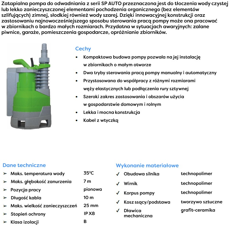Pompy zatapialne Omnigena SP AUTO to solidne i trwałe pompy o zwartej budowie oraz niskiej cenie. Przeznaczone są do pompowania czystej, zimnej wody, oraz cieczy z obecnością zanieczyszczeń o maksymalnej średnicy do 25mm. Temperatura pompowanego medium nie powinna przekroczyć 35°C. Wykorzystywane są do wypompowywania wody z zalanych pomieszczeń, piwnic, studzienek, basenów, zbiorników oraz szamb. Pompy Omnigena serii SP AUTO posiadają wbudowany wyłącznik pływakowy, który steruje i chroni pompę przed pracą na sucho, oraz umożliwia ich zastosowanie w wąskich otworach studziennych. Wyposażone są także w elektroniczny suwak, który umożliwia regulację poziomu załączania. Pompy posiadają również dwie funkcje pracy – AUTO i MANUAL. Urządzenia nie są przystosowane do ciągłej pracy.