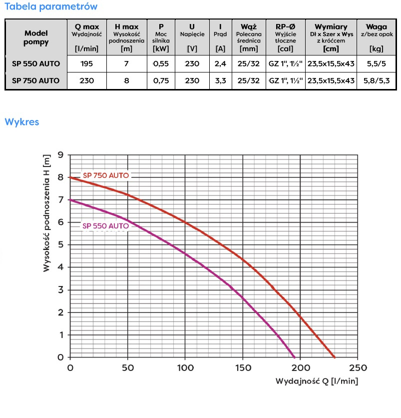 Pompy zatapialne Omnigena SP AUTO napędzane są wydajnymi silnikami elektrycznymi jednofazowymi, zasilanymi prądem o napięciu 230V, które chłodzone są pompowaną cieczą. Posiadają również wbudowany sterownik pływakowy oraz elektroniczny suwak regulujący poziom załączania się pompy.