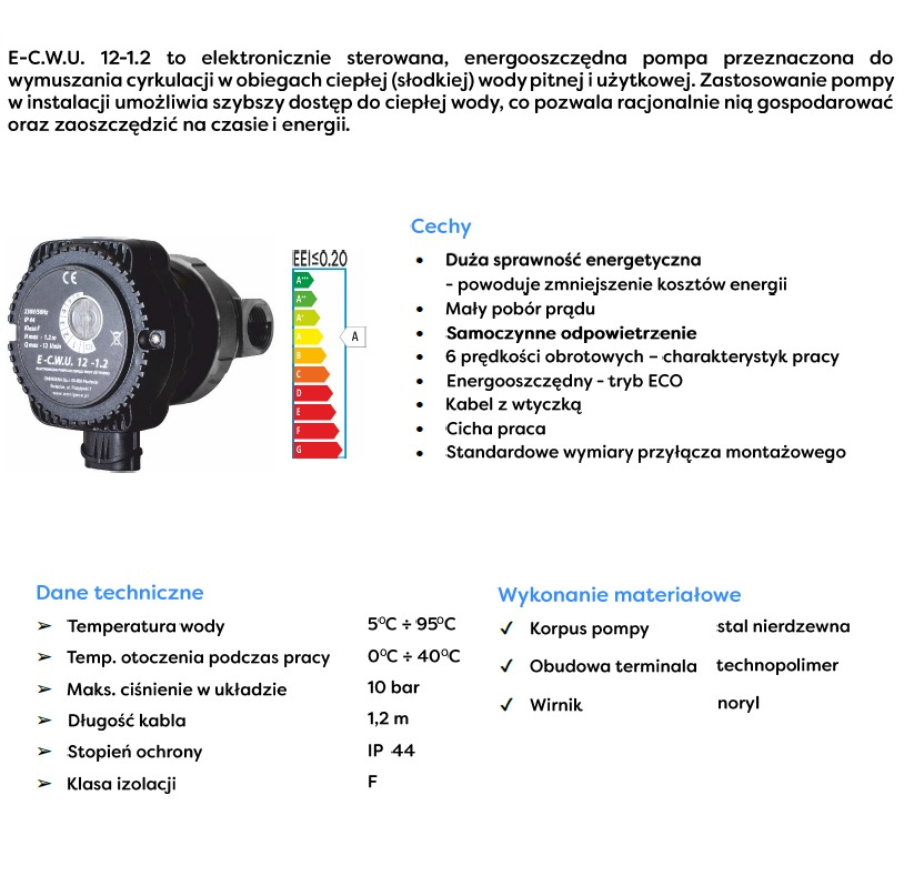 Pompy cyrkulacyjne E‑C.W.U. Omnigena przeznaczone są do wymuszania obiegu ciepłej wody użytkowej wody w układach centralnego ogrzewania. Wyróżnia ją 6 prędkości obrotowych, co wpływa na osiąganie bardzo dobrych parametrów. Wykorzystywane są do pracy jedynie w obiegach wodnych, których maksymalna temperatura nie przekroczy 95°C. Pompy cyrkulacyjne E‑C.W.U. nie mogą pompować wody z glikolem, oraz takiej, w której obecne są stałe zanieczyszczenia, jak kamień kotłowy lub rdza. Ich obecność może spowodować przedwczesne zużycie się urządzeń. Wysoka jakość pomp cyrkulacyjnych Omnigena E‑C.W.U, w połączeniu z dużą energooszczędnością co zapewnia zastosowanie trybu ECO, sprawia, że cieszą się one szerokim uznaniem oraz są jednymi z najczęściej wybieranych urządzeń do wymuszania obiegu wody. Pompy cyrkulacyjne do ciepłej wody użytkowej Omnigena powinny być montowanie w zadaszonych, pozbawionych wilgoci pomieszczeniach.