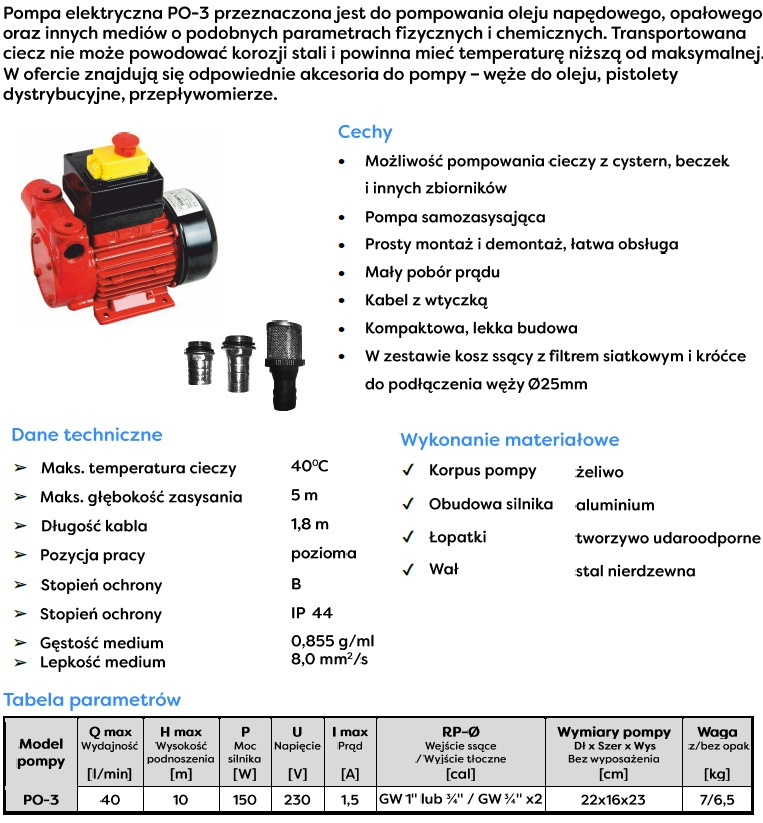 Pompy PO 3 / 230V Omnigena to niezwykle trwałe urządzenia, charakteryzujące się bardzo dobrymi parametrami, takimi jak wydajność oraz wysokość podnoszenia. Pompy do paliw PO wykorzystywane są do tłoczenia oleju napędowego oraz oleju opałowego. Ich konstrukcja pozwala również na tłoczenie innych substancji o właściwościach chemicznych i fizycznych, nie powodujących korozji elementów stalowych pomp, a także mieszczących się w dopuszczalnej granicy lepkości oraz gęstości, a ich temperatura nie przekracza 40°C. Pompy do paliwa typy PO Omnigena znajdują zastosowanie głównie do indywidualnego użytku domowego lub w gospodarstwach rolnych, jednak mogą być również wykorzystane w miejscach, gdzie dystrybucja paliwa jest zdecydowanie większa, na przykład w przemyśle transportowym czy hutnictwie lub górnictwie. Maksymalna głębokość zasysania pomp wynosi 2 metry.