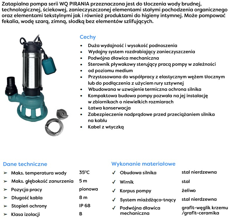 Pompy zatapialne Omnigena z serii WQ PIRANIA to trwałe i wydajne jednowirnikowe pompy, wyróżniające się stosunkowo niską ceną. Wyposażone są w rozdrabniacz, czyli specjalny nóż tnący, który poradzi sobie z obecnością dużych zanieczyszczeń. Posiadają również mocny silnik, który zapewnia znakomite parametry. Przeznaczone są do pompowania ścieków surowych, gnojowicy, wody z obecnością zanieczyszczeń włóknistych, jak również czystej, zimnej wody, której maksymalna temperatura nie będzie większa niż 35°C. Wykorzystywane są do indywidualnego użytku, między innymi przez rolników, do wypompowywania szamba, wody z zalanych pomieszczeń, czerpania wody ze stawów oraz podlewania ogródków. Znajdują również zastosowanie w firmach budowlanych do opróżniania zalanych wykopów czy budowanych piwnic, a także przez przedsiębiorstwa komunalne i przedsiębiorstwa hodowlane. Pompy wyposażone są w króćce, przeznaczone do pracy z elastycznymi wężami, a także w wbudowany sterownik pływakowy. Maksymalna głębokość zanurzenia pomp zatapialnych Omnigena serii WQ PIRANIA wynosi 5 m.