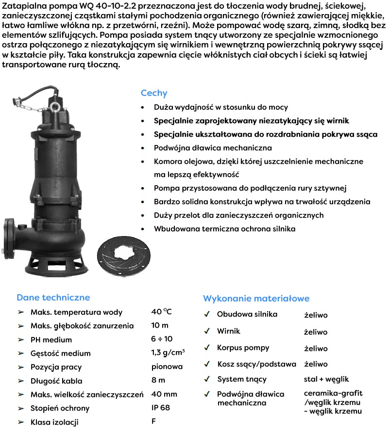 Pompy zatapialne Omnigena z serii WQ 40‑10‑2,2 to trwałe i wydajne pompy. Wyróżniają się bardzo dobrymi parametrami oraz niską ceną, dzięki czemu urządzenia te są bardzo atrakcyjne i często wybierane przez indywidualnych odbiorców. Przeznaczone są do pompowania ścieków, gnojowicy, wody z obecnością zanieczyszczeń włóknistych, oraz czystej, zimnej wody, której maksymalna temperatura nie będzie większa niż 35°C. Wykorzystywane są do indywidualnego użytku, między innymi przez rolników, do wypompowywania szamba, wody z zalanych pomieszczeń, czerpania wody ze stawów oraz podlewania ogródków. Znajdują również zastosowanie w firmach budowlanych do opróżniania zalanych wykopów czy budowanych piwnic. Pompy wyposażone są w króćce, przeznaczone do pracy z elastycznymi wężami, a także w wbudowany sterownik pływakowy. Maksymalna głębokość zanurzenia pomp zatapialnych Omnigena serii WQ wynosi 10 m.
