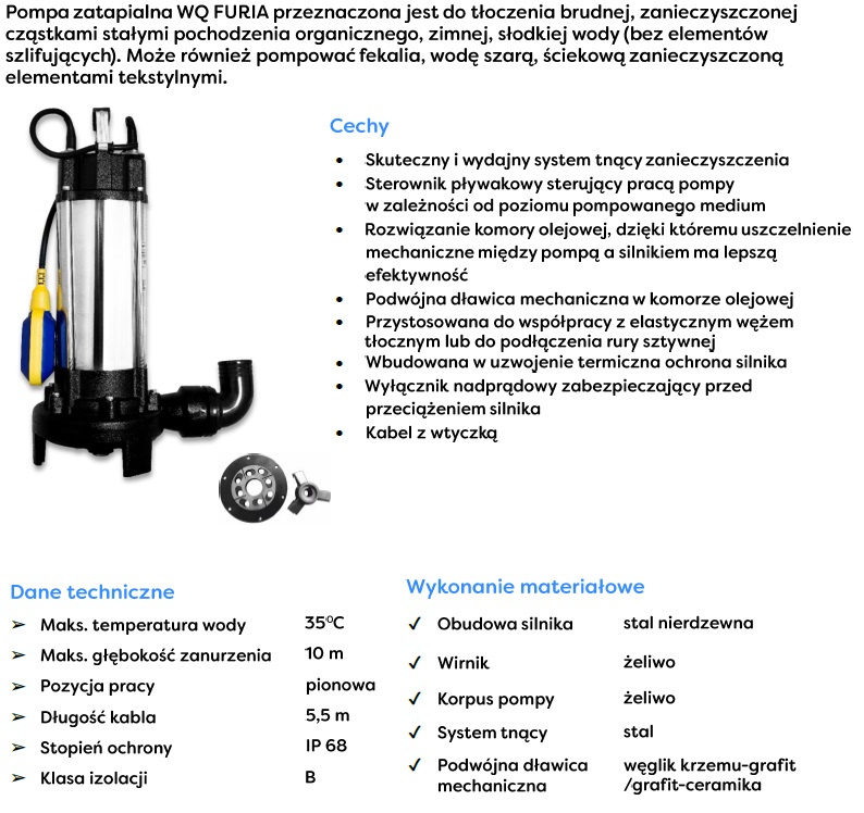 Pompy zatapialne Omnigena z serii WQ FURIA to trwałe i wydajne pompy. Wyróżniają się znakomitymi parametrami oraz przystępną ceną, dzięki czemu urządzenia te są bardzo atrakcyjne i często wybierane przez indywidualnych odbiorców. Przeznaczone są do pompowania ścieków, gnojowicy, wody z obecnością zanieczyszczeń włóknistych, oraz czystej, zimnej wody, której maksymalna temperatura nie będzie większa niż 35°C. Wykorzystywane są do indywidualnego użytku, między innymi przez rolników, do wypompowywania szamba, wody z zalanych pomieszczeń, czerpania wody ze stawów oraz podlewania ogródków. Znajdują również zastosowanie w firmach budowlanych do opróżniania zalanych wykopów czy budowanych piwnic, a także przez przedsiębiorstwa komunalne. Pompy wyposażone są w króćce, przeznaczone do pracy z elastycznymi wężami, a także w wbudowany sterownik pływakowy. Maksymalna głębokość zanurzenia pomp zatapialnych Omnigena serii WQ FURIA wynosi 5 m.