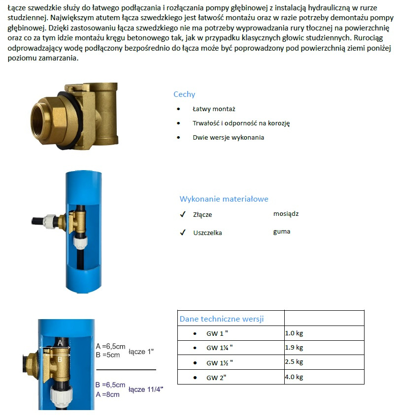 Złącza szwedzkie są niezwykle pomocne w łatwym i szczelnym zamontowaniu pompy głębinowej, jak również i jej demontowaniu. Umożliwiają jej montaż bezpośrednio w studni. Złącza szwedzkie eliminują konieczność wprowadzania do otworu studni rury tłocznej pond rurę osłonową, a także wykluczają stosowanie kręgu wykończenia studni głębinowej.