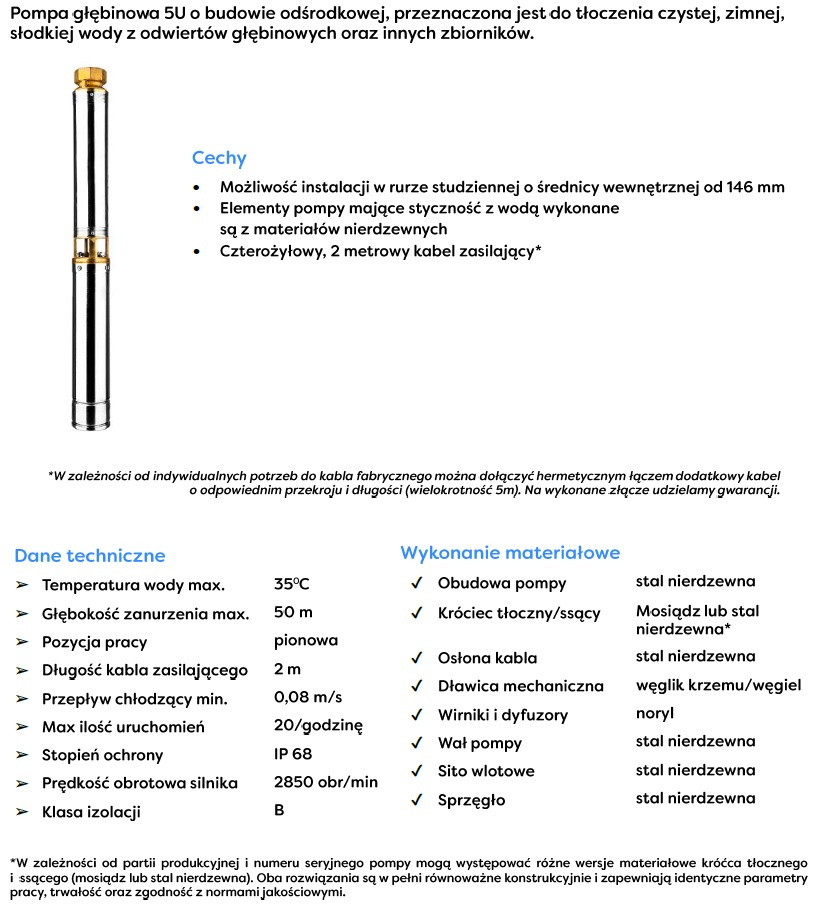 Unikalna konstrukcja pomp głębinowych 5U sprawia, że przy wydajności 740 l/m i średnicy 125 mm można je z powodzeniem zastosować w rurze osłonowej 160 mm. To jedyne takie pompy w super cenie ! Pompy głębinowe typu 5U przeznaczone są do czerpania czystej, zimnej wody z wierconych ujęć głębinowych, studni kręgowych oraz innych zbiorników wodnych. Przy studniach kręgowych i zbiornikach powinna być zastosowana rura osłonowa wymuszająca chłodzenie silnika. Pompa nie powinna pompować wody z częściami stałymi szlifującymi. Pompy głębinowe 5U są odporne na piasek ! Konstrukcja pomp 5U dopuszcza tłoczenie wody z zawartością piasku max do 5%, wyposażona w fabryczny kabel o długości 1m. Pompy posiadają 2 letnią gwarancję !
