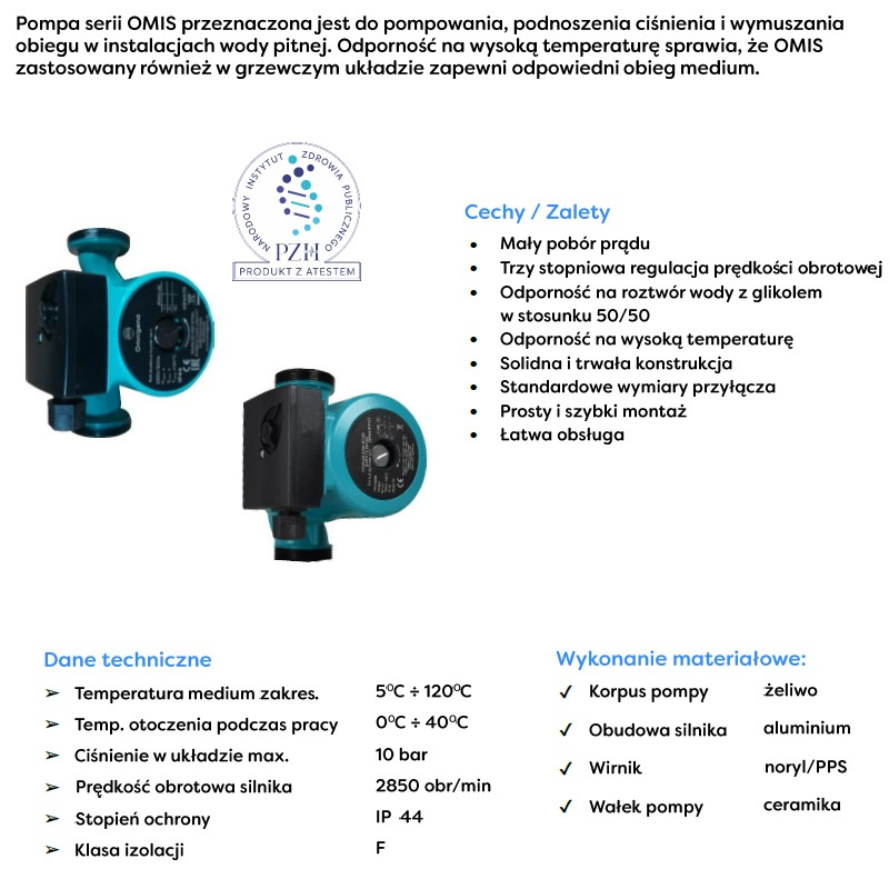 Pompy cyrkulacyjne C.O. Omnigena serii Omis przeznaczone są do wymuszania obiegu wody w układach centralnego ogrzewania i w systemach ogrzewania solarnego, a także do pompowania wody pitnej. Wyróżniają się trzystopniową regulacją prędkości obrotowej. Wykorzystywane są do pracy w obiegach wodnych, oraz obiegach wypełnionych wodą z domieszką glikolu, których maksymalna temperatura nie będzie niższa niż 5°C, a jednocześnie nie przekroczy 120°C. Urządzenia Omis nie mogą pompować wody z glikolem, w której obecne są stałe zanieczyszczenia, takie jak kamień kotłowy lub rdza. Wysoka jakość pomp cyrkulacyjnych C.O. Omnigena Omnis w połączeniu ze standardowymi wymiarami montażowymi sprawia, że są to jedne z najczęściej wybieranych urządzeń do wymuszania obiegu wody. Pompy obiegowe Omis powinny być montowanie w zadaszonych, pozbawionych wilgoci pomieszczeniach.