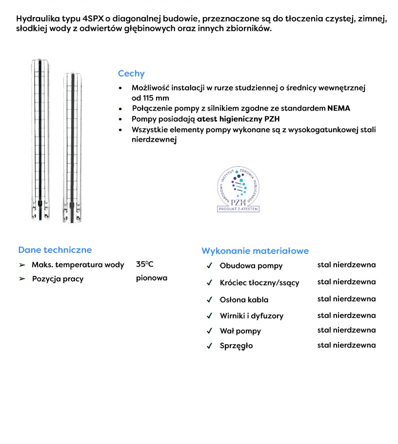 Pompy głębinowe SPX służą do wynoszenia czystej, zimnej wody o temperaturze, nie większej niż 30°C, pozbawionej zanieczyszczeń ściernych oraz długowłóknistych. Mimo wszystko wyróżniają się podwyższoną odpornością na obecność piasku w cieczy, za sprawą unikalnej konstrukcji. Pompy głębinowe SPX wykorzystywane są do pompowania wody ze studni głębinowych, oraz w zbiornikach kręgowych wolnostojących, z lustrem wody poniżej 8m.