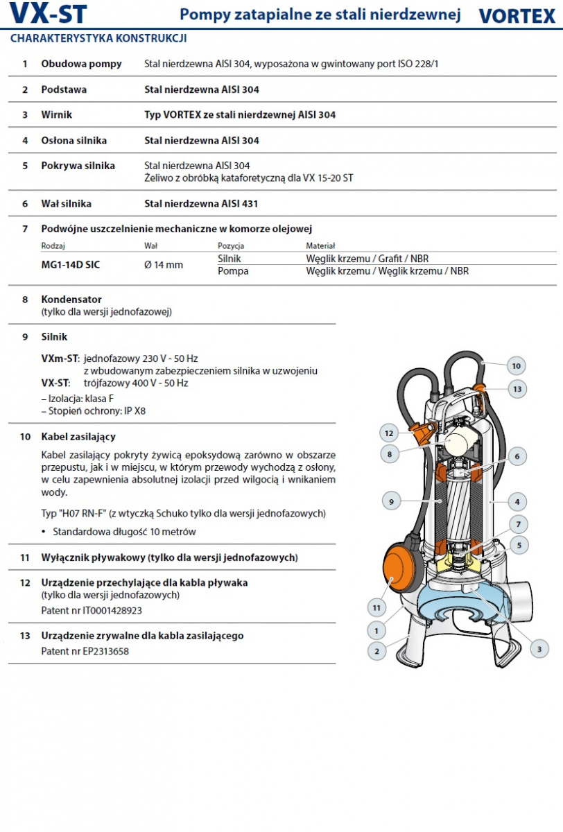 Podstawowe komponenty pomp zatapialnych Pedrollo VX wykonane zostały z najtrwalszych, odpornych na korozję materiałów takich jak: