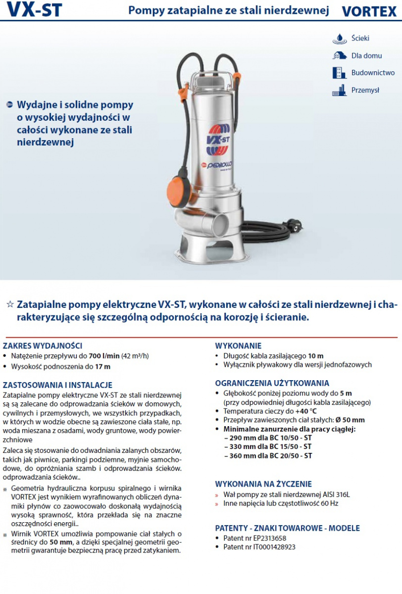 Pompy zatapialne VX‑ST Pedrollo ze stali nierdzewnej są zalecane do odprowadzania ścieków w zastosowaniach domowych, cywilnych i przemysłowych, w każdym przypadku, gdy w zawiesinie znajdują się ciała stałe, na przykład woda zmieszana z błotem, woda gruntowa, woda powierzchniowa. Nadają się do osuszania zalanych obszarów, takich jak piwnice, podziemne parkingi, myjnie samochodowe, do opróżniania szamb i odprowadzania ścieków. Pompy te wyróżniają się niezawodnością, którą można najlepiej docenić w automatycznych warunkach pracy w instalacjach stałych