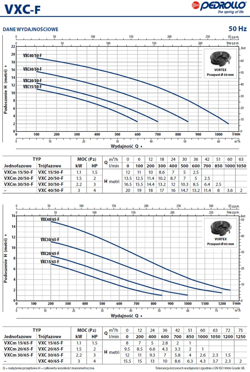 Seria pomp Pedrollo VXC F 50‑70 wykonana z wytrzymałego, odpornego na długotrwałe ścieranie, jest wyposażona w wirnik VORTEX i jest odpowiednie do odprowadzania ścieków, wody zmieszanej z błotem, płynów zawierających powietrze lub gaz oraz gnijących błota. Zalecane są do stałych instalacji, gdy są umieszczane w odpowiednich studniach, w kanałach, tunelach, studniach, podziemnych parkingach itp.