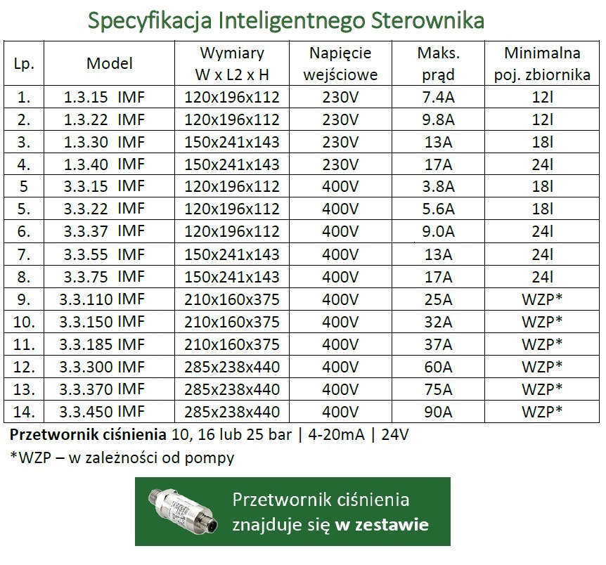 Inteligentny sterownik IMF 3.3.22 (2,2kW 400V/MAX.5,6A) przeznaczony jest do usprawniania pracy pomp za sprawą przekształconego prądu o regulowanym napięciu i częstotliwości. Jego zastosowanie pozwala w znacznym stopniu wydłużyć żywotność zestawu. Ponadprzeciętne parametry urządzenia pozwalają również wyeliminować z zestawu zbiornik hydroforowy, zachowując jednocześnie prostotę i funkcjonalność całego układu.