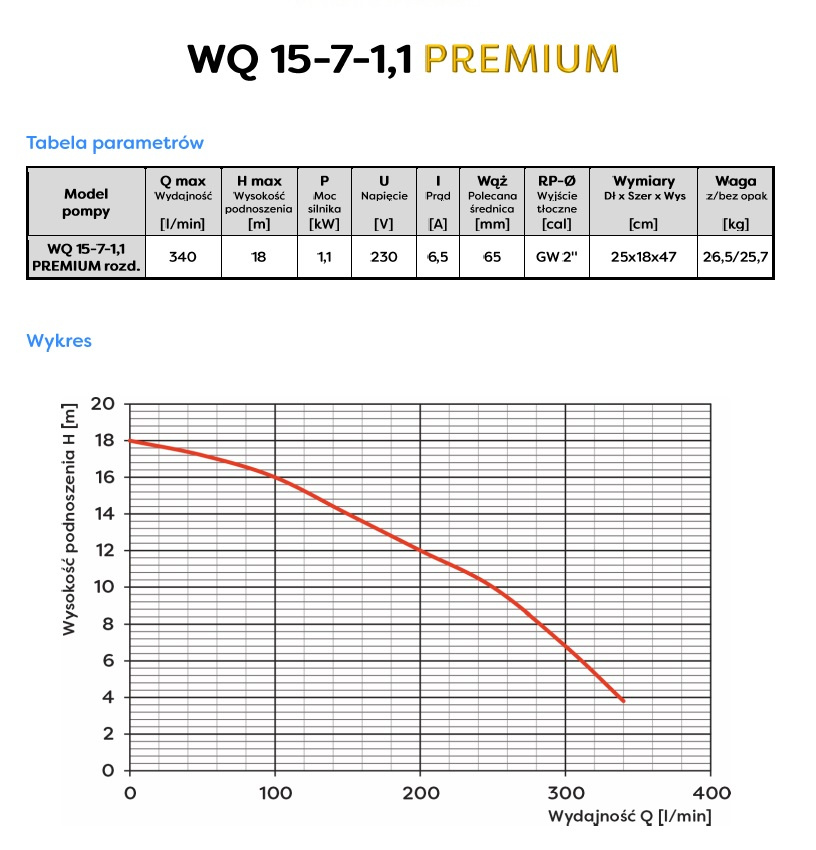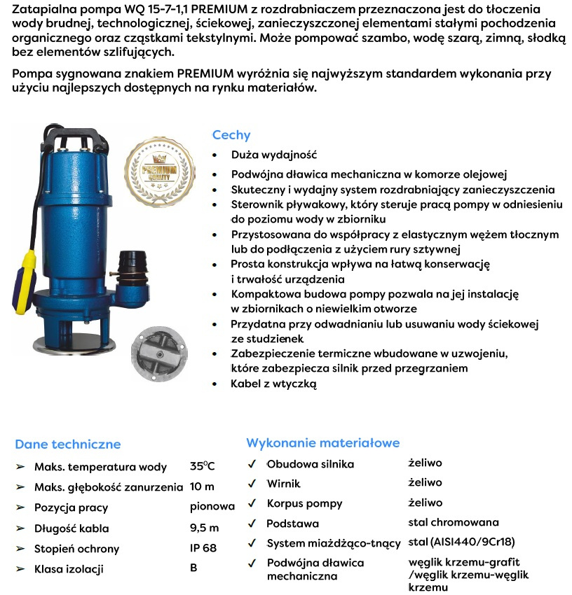 - pompa zatapialna WQ 15‑7‑1,1 PREMIUM 230V z rozdrabniaczem