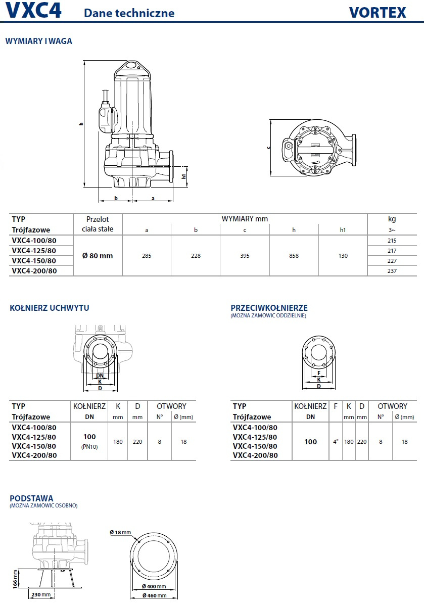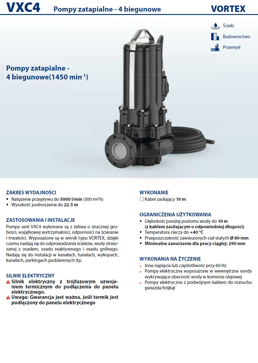 VXC4 seria pomp, wykonana z wytrzymałego, odpornego na długotrwałe ścieranie materiału. Pompa jest wyposażona w wirnik VORTEX i jest przeznaczona do odprowadzania brudnej wody, ścieków oraz wody zmieszanej ze błotem. Nadają się do instalacji w kanałach ściekowych, tunelach, wykopach, kanałach, podziemnych parkingach itp.