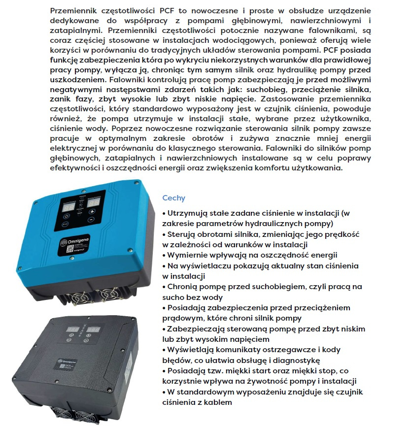 Falownik OMNIGENA ‑ sterownik PCF 4‑3/3(DO 4kW 400V/OD 4,1 DO 15,0 A) to urządzenie elektroniczne, które współpracując z silnikiem pompy głębinowej albo hydroforowej steruje pracą tych pomp. Główną zaletą zastosowania falownika jest zapewnienie stałego ciśnienia wody w instalacji hydraulicznej, (w granicach parametrów hydraulicznych pompy). Dzięki możliwości podłączenia do falownika zewnętrznego czujnika ciśnienia oraz wbudowanym w urządzenie regulatorom, falownik na bieżąco kontroluje ciśnienie w instalacji wodociągowej i w przypadku, odbiegającej od zadanej przez użytkownika wartości ciśnienia reaguje poprzez zmianę prędkości obrotowej silnika. W przypadku zmniejszonego poboru wody falownik PCF spowalnia obroty silnika zmniejszając tym samym zużycie energii elektrycznej.