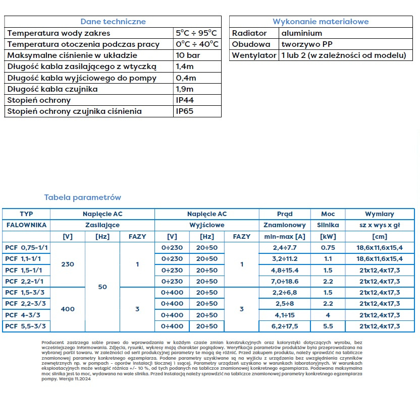 DANE TECHNICZNE FALOWNIKÓW PCF