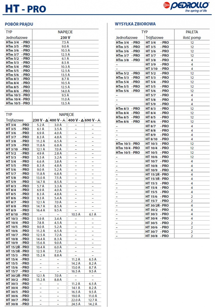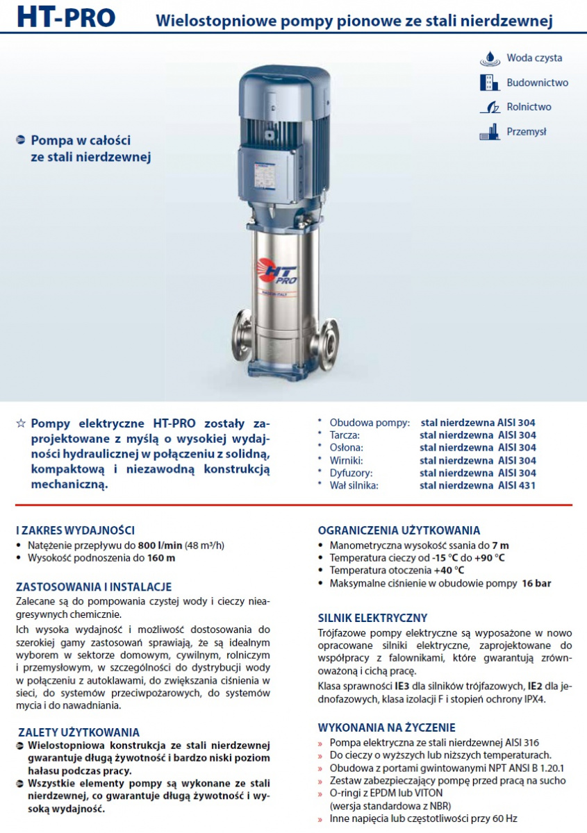Pompy pionowe marki Pedrollo typu HT‑PRO to wielostopniowe pompy, które nadają się do stosowania z wodą do picia oraz z cieczami, które nie są chemicznie agresywne w stosunku do materiałów, z których wykonano pompę. Wysoka perdlamancja i możliwość dostosowania do szerokiego zakresu zastosowań sprawiają, że są idealnym wyborem do zastosowań domowych, cywilnych i przemysłowych, w szczególności do dystrybucji wody w połączeniu ze zbiornikami ciśnieniowymi i do zwiększania ciśnienia w sieci. Instalację należy wykonywać w dobrze wentylowanych zamkniętych pomieszczeniach lub chronić pompę przed bezpośrednim działaniem złych warunków pogodowych.