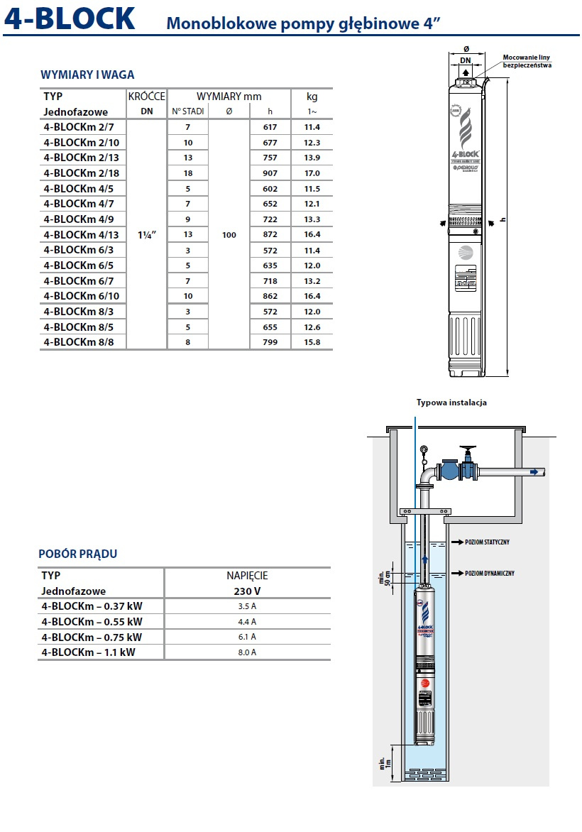 Pompy głębinowe 4BLOCK wyposażone są wyłącznie w jednofazowy silnik elektryczny zasilany prądem o napięciu 230V. Silnik posiada wbudowany kondensator oraz termiczne zabezpieczenie przed przeciążaniem.
