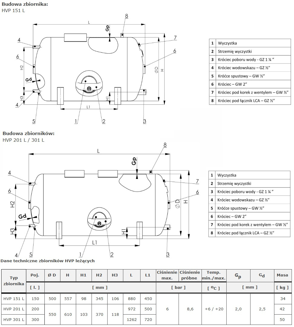 Zbiorniki hydroforowe ocynkowane posiadają pionową orientację, którą zapewniają trzy nogi, przyspawane do zbiornika na jego obwodzie. Ponadto w części walcowej zbiornika umieszczona jest rurka wodowskazu, która ułatwia monitorowanie ilości nagromadzonej cieczy. Idąc wyżej, w płaszczu zbiornika umiejscowiono otwór wyczystkowy. W górnej części zbiornika zainstalowano manometr – w otworze G2 zaślepionym gwintowanym kołkiem.