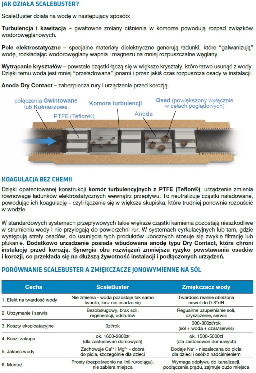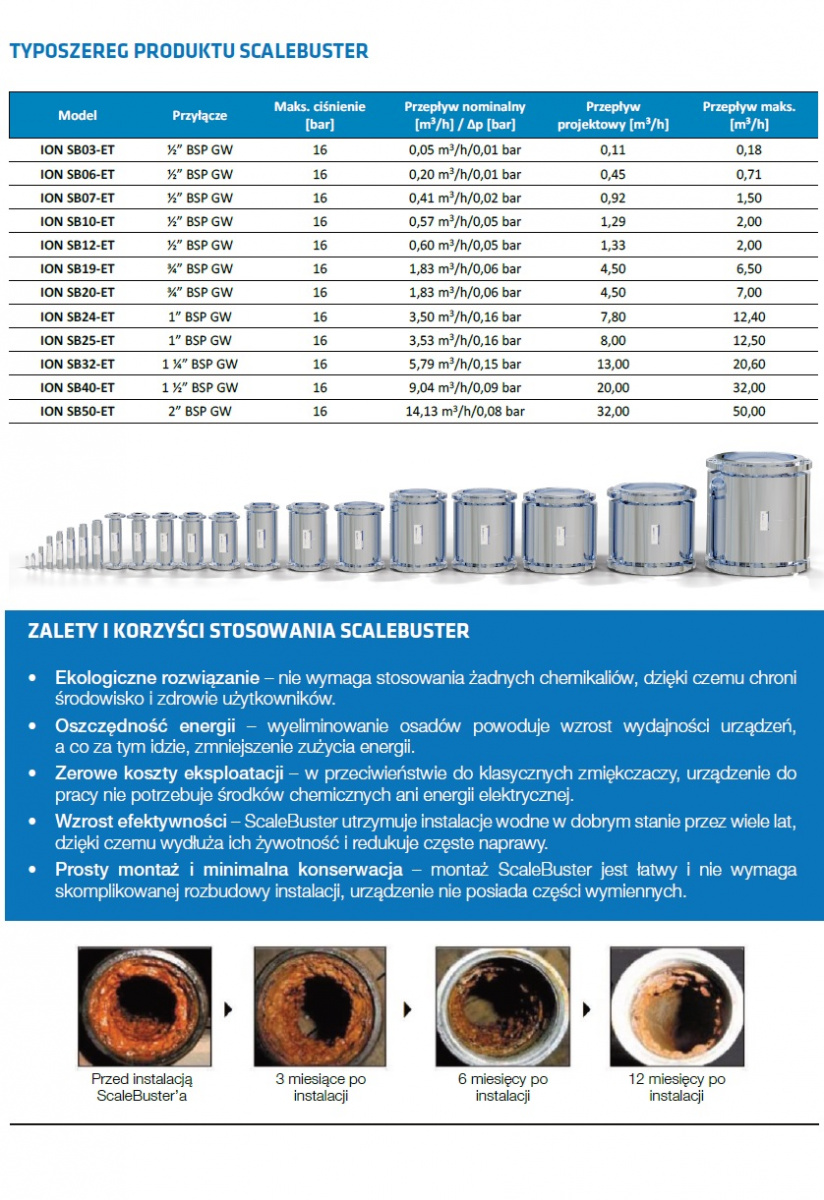 istniejące już osady wewnątrz rur i urządzeń. Uzdatnianie oparte jest na technologii elektrostatycznej ION ScaleBuster, która działa skutecznie i wydajnie bez