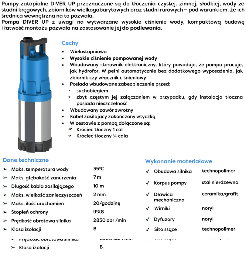 Pompy zatapialne serii DIVER UP 1300 to monoblokowe pompy, które wyróżniają się wysoką trwałością, a przede wszystkim bardzo dobrą wydajnością. Urządzenia przeznaczone są do pompowania czystej wody, która nie jest agresywna chemicznie oraz mechanicznie. Tłoczone substancje muszą bezwzględnie być pozbawione domieszek szlifujących oraz długowłóknistych. Producent dopuszcza jednak śladową obecność niewielkich zanieczyszczeń o maksymalnej średnicy do 1mm. Maksymalna temperatura pompowanego medium nie może przekroczyć 35°C. Pompy zatapialne serii DIVER UP 1300 wykorzystywane są najczęściej do wypompowywania wody z zalanych budynków oraz pomieszczeń. Mogą one również posłużyć do podlewania, a także do zaopatrywania niewielkich budynków mieszkalnych w czystą wodę użytkowa, ze studni kręgowych. Jest to możliwe dzięki zastosowaniu najnowszych rozwiązań konstrukcyjnych. Unikatową cechą pomp DIVER UP 1300 jest zdolność do wytworzenia ciśnienia w instalacji tłocznej rzędu 4,5 bar, co pozwala im pracować jak hydrofor – jednak bez konieczności instalowania dodatkowego osprzętu jak zbiornik lub wyłącznik ciśnieniowy. Dodatkowo pompy wyposażone są w wyłącznik pływakowy, który steruje ich pracą oraz chroni przed suchobiegiem.