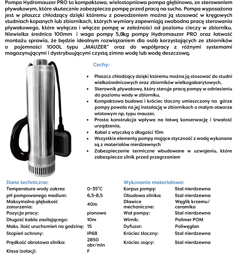 Pompy głębinowe Omnigena HYDROMAUZER PRO to monoblokowe pompy, w których sekcja hydrauliczna jest zintegrowana z silnikiem elektrycznym. Wyróżniają się wysoką wydajnością oraz wieloletnim okresem pracy, a także wbudowanym czujnikiem pływakowym. Przeznaczone są do tłoczenia czystej wody, nieagresywnej chemicznie i mechanicznie, pozbawionej domieszek długowłóknistych, oraz takich o właściwościach szlifujących. Wykorzystywane są do pompowania wody z ujęć, gdzie lustro wody znajduje się na głębokości przynajmniej 8m, czyli ze studni głębinowych, a także dzięki innowacyjnej konstrukcji, jaką jest zasysanie wody u dołu, oraz wyposażenie w seryjnie wbudowany płaszcz chłodzący co umożliwia stosowanie pomp w studniach kręgowych i zbiornikach o dużej średnicy otworu studziennego bez konieczności stosowania dodatkowej rury osłonnej wymuszającej chłodzenie.
