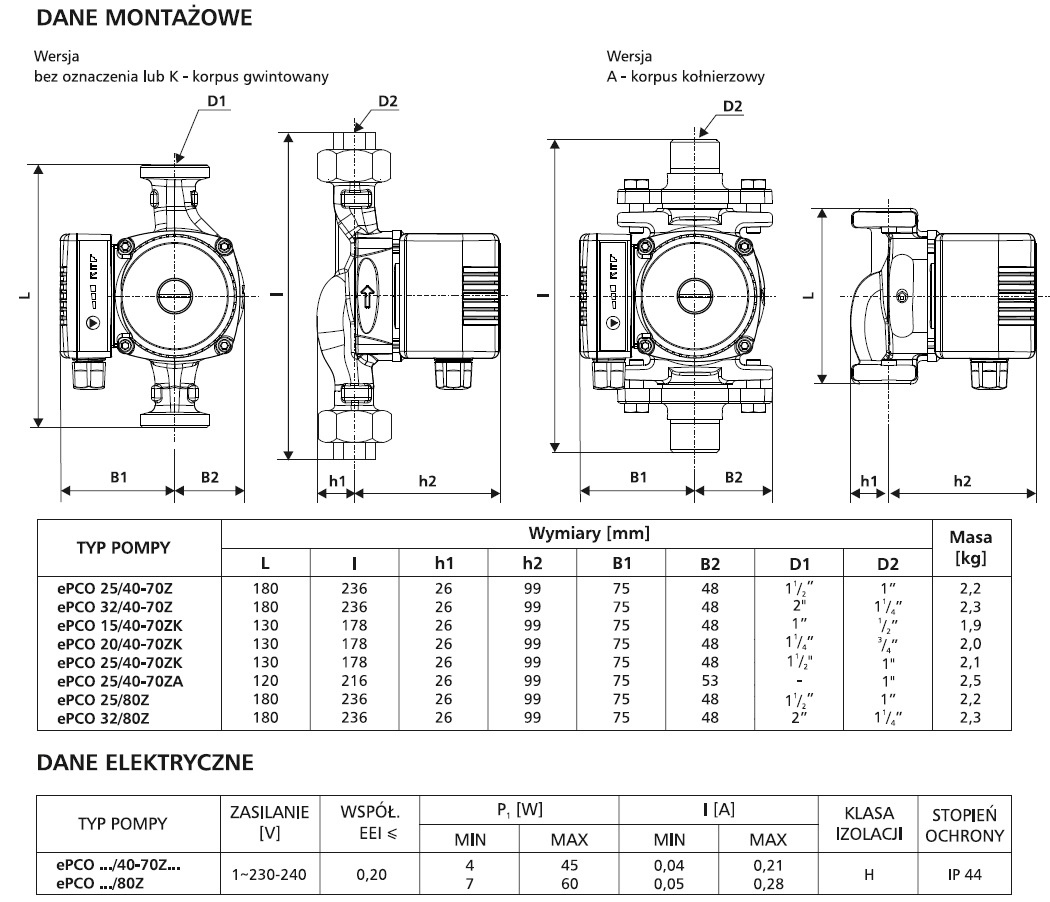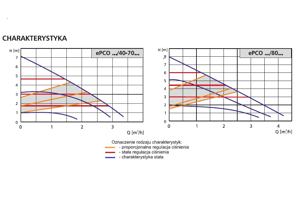 ZASTOSOWANIE: Wymuszenie obiegu w instalacjach C.O ‑ jedna pompa dwie wysokości podnoszenia. Jeden model pompy ePCO 25/40‑70 zastępuje jednocześnie w parametrach Q (wydajność) i H (wysokość podnoszenia) dwa typy pomp 25/40 i 25/60. Jak to możliwe? Jedna pompa dwie charakterystyki. Dzieje się tak za pośrednictwem jedno‑sekwencyjnego przycisku umieszczonego na panelu sterującym silnika pompy. Pozwala on na wybranie odpowiedniej charakterystyki stałej lub proporcjonalnej z wysokością podnoszenia 4, 5 lub 6m.