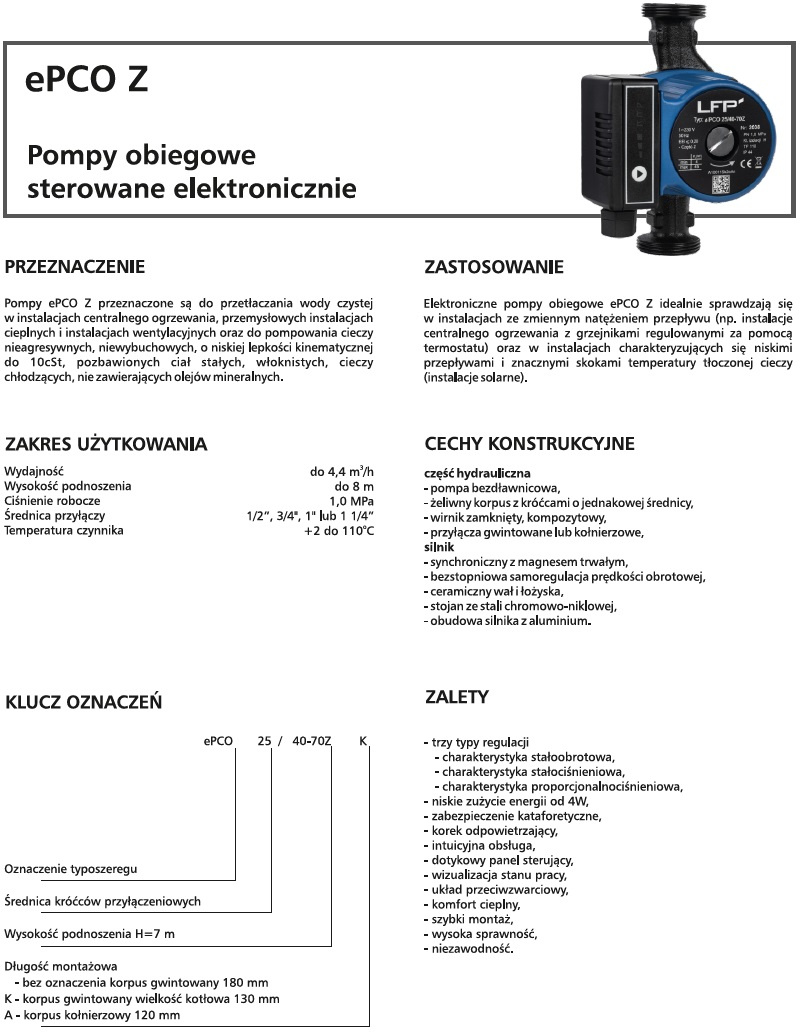 Elektroniczna pompa obiegowa ePCO Z to kolejny produkt, z typoszeregu małych pomp obiegowych, który Leszczyńska Fabryka Pomp wprowadziła na rynek. Dzięki zaawansowanej technologii, zastosowaniu synchronicznego silnika z magnesem trwałym i przetwornicy częstotliwości, pompa zapewnia w swych aplikacjach optymalną wydajność i przynosi znaczące korzyści w oszczędzaniu energii. Zastosowana elektronika pozwala na odpowiednie ustawienia parametrów i dostosowanie charakterystyk do instalacji grzewczej. Korpus żeliwny, silnik mokry smarowany tłoczoną cieczą z korkiem odpowietrzającym, wał ceramiczny, tuleja ze stali nierdzewnej i wirnik z technopolimeru tworzą konstrukcyjną całość.