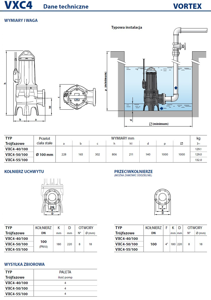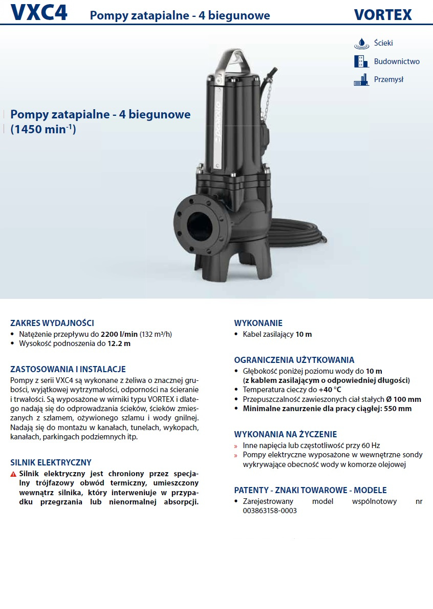 VXC4 seria pomp, wykonana z wytrzymałego, odpornego na długotrwałe ścieranie materiału. Pompa jest wyposażona w wirnik VORTEX i jest przeznaczona do odprowadzania brudnej wody, ścieków oraz wody zmieszanej ze błotem. Nadają się do instalacji w kanałach ściekowych, tunelach, wykopach, kanałach, podziemnych parkingach itp.
