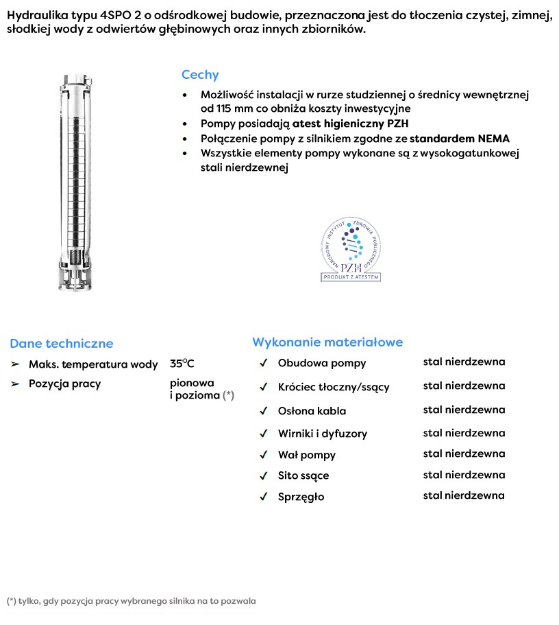 Cecha charakterystyczną pomp głębinowych SPO, wyróżniającą się spośród innych modeli jest to, że wykonane są one w całości z ponadprzeciętnie odpornej na działanie czynników korozyjnych stali nierdzewnej. Zastosowanie takiego rozwiązania konstrukcyjnego zapewnia pompom SPO niezwykle długą żywotność. Dołączając do tego doskonałe i zróżnicowane parametry, powstaje urządzenie, które cieszy się szerokim uznaniem i wykorzystaniem w wielu zróżnicowanych miejscach.