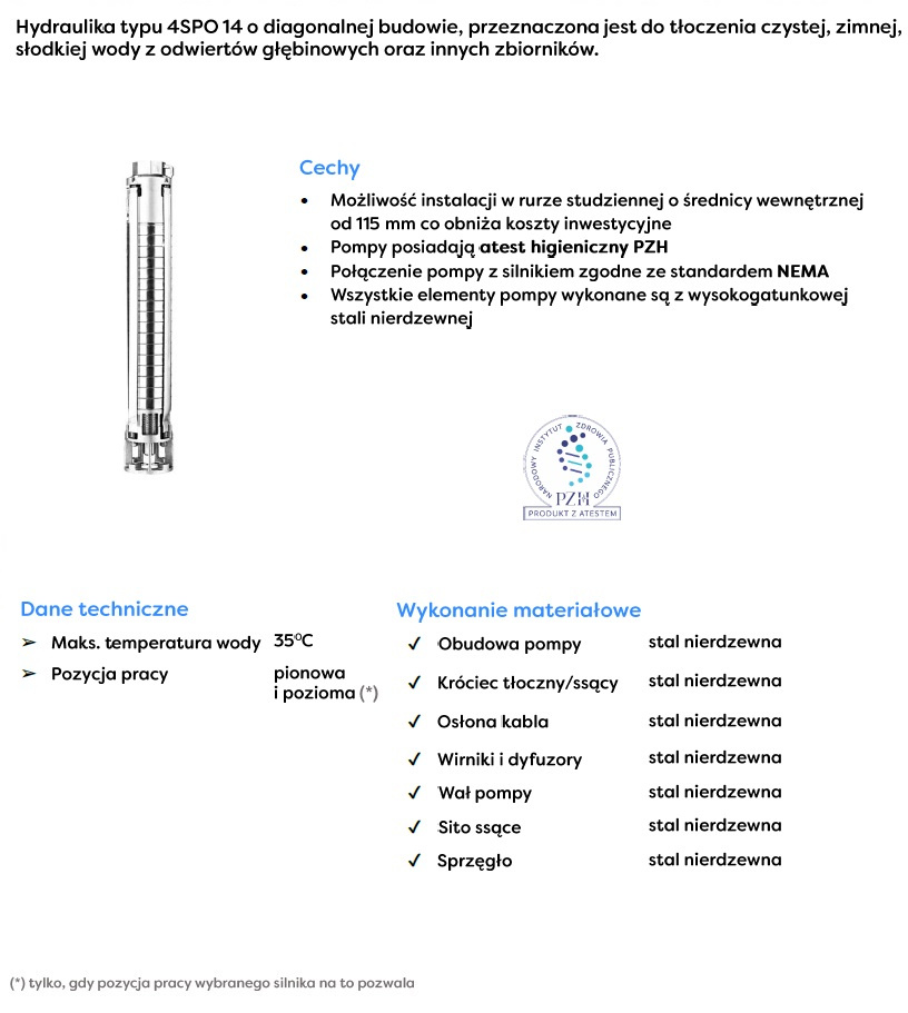 Pompy głębinowe SPO służą do wynoszenia czystej, zimnej wody o temperaturze, nie większej niż 30°C, pozbawionej zanieczyszczeń ściernych oraz długowłóknistych. Mimo wszystko wyróżniają się podwyższoną odpornością na obecność piasku w cieczy, za sprawą unikalnej konstrukcji. Pompy głębinowe SPO wykorzystywane są do pompowania wody ze studni głębinowych, oraz w zbiornikach kręgowych wolnostojących, z lustrem wody poniżej 8m.
