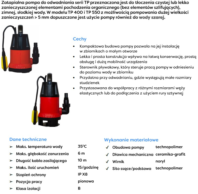 Pompy zatapialne Omnigena serii TP to wydajne urządzenia, o wysokiej sprawności oraz monoblokowej budowie. Wyposażone są w króćce przystosowane do pracy z elastycznymi wężami, oraz w silniki elektryczne jednofazowe na prąd zmienny. Przeznaczone są do pompowania czystej wody oraz cieczy z niewielką obecnością miękkich ciał stałych. Maksymalna temperatura pompowanej cieczy nie powinna przekroczyć 35°C. Pompy zatapialne Omnigena TP wyróżniają się niewielką wagą oraz stosunkowo wysoką mocą. Dzięki temu wykorzystywane są do wypompowywania wody z basenów, zalanych pomieszczeń, do opróżniania szamba, a także do podlewania ogródków. Pompy wyposażone są w wyłącznik pływakowy, który steruje pracą i chroni ją przed suchobiegiem. Maksymalna głębokość zanurzenia pomp zatapialnych Omnigena TP wynosi 5,5 m. Urządzenia nie są przystosowane do ciągłej pracy.